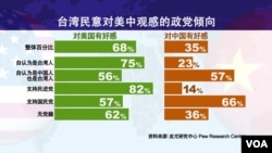 从数据上也可以清楚看到政党倾向与国族认同直接导致对美中态度的差异。民进党的支持者对美国有好感的高达82%,对中国有好感的只有14%,而国民党支持者对美国有好感为57%,对中国有好感的达66%。自认为是台湾人的对美国有好感达到75%,对中国有好感的仅23%,自认为是中国人也是台湾人对美国有好感的为56%,对中国有好感的为57%。谭妲就以上数据分析指出:“调查发现,如果认为自己是台湾人也是中国人,或是政党倾向支持国民党的台湾民众,比较容易对中国有好感,因此国族认同与政党倾向在台湾民众看待中国态度上扮演了一定的角色。”